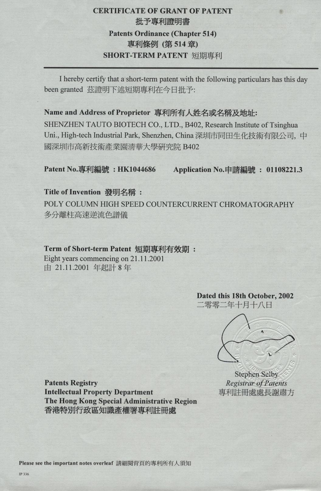 多分離柱高速逆流色譜儀專利證書-香港