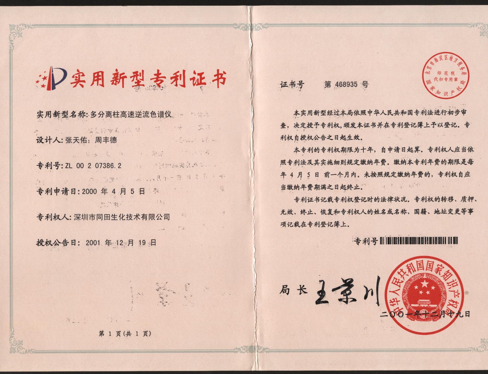 多分離柱高速逆流色譜儀專利證書-TBE