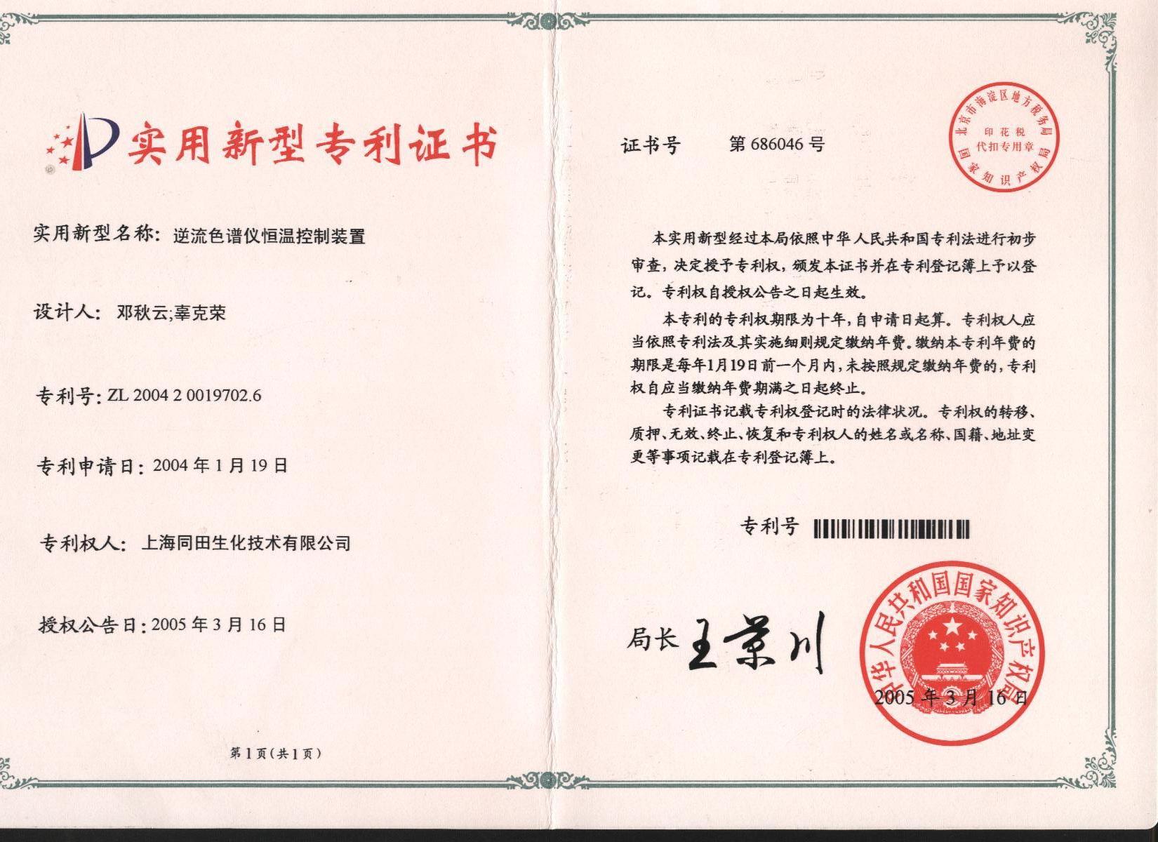 逆流色譜儀恒溫控制裝置專利證書
