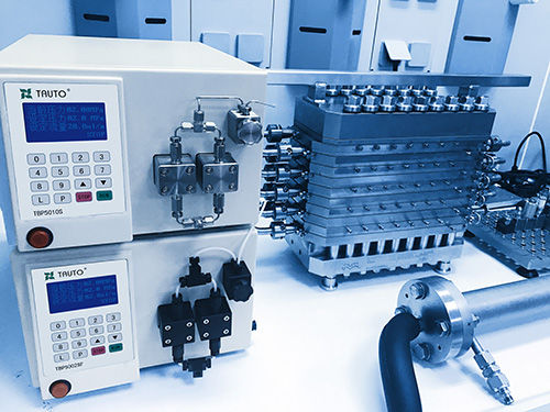 TBP-2H02SF管道及泵頭采用PTFE(聚四氟乙烯)材料,相較316L不銹鋼/PEEK/金屬鈦材料,PTFE材料惰性更強,可滿足實驗中精確恒流恒壓輸送強腐蝕溶劑的要求。