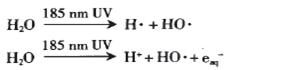 TOC消解器中裝有一根可產生185nm波長的紫外燈管,當純水用185nm紫外光直接照射時,水中TOC與光子直接碰撞的幾率很低,靠水中TOC雜質直接吸收185nm紫外光光子能量再分解并形成C02逸出是很困難的,所以可以認為185nm紫外光降解水中TOC時185nm紫外光先與水作用,引起水的均裂反應,其反應式如下: